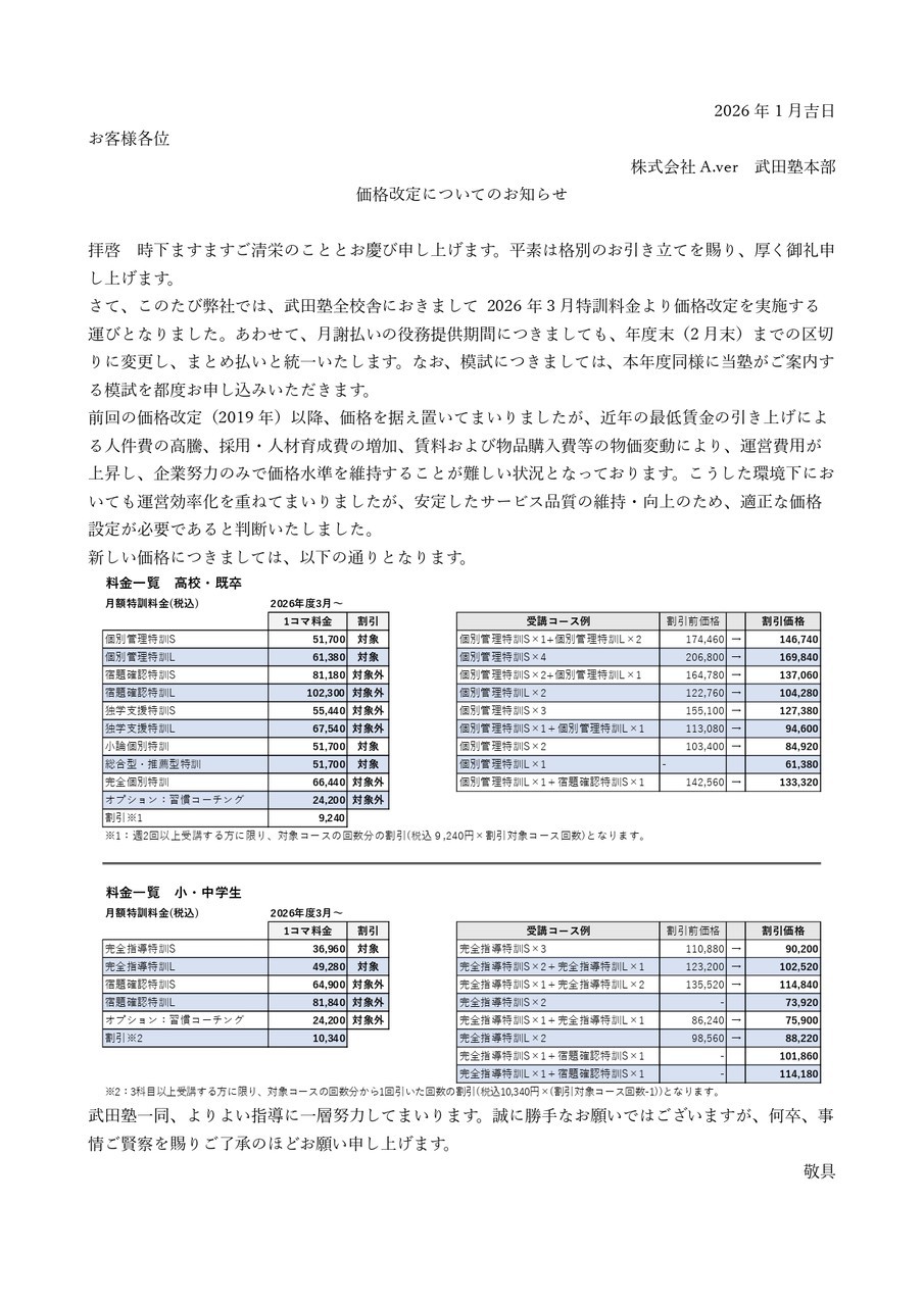 【全体向け】次年度料金の改定について